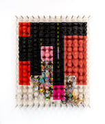 Acrylic and collaged fabric on wood panel with custom wood frame and vintage antenna
